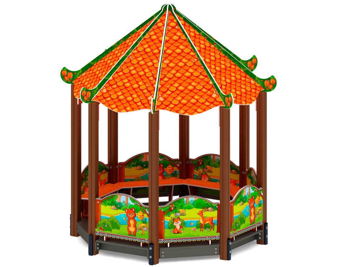Крыша состоит из скатов крыши из фанеры 12 мм, скаты опираются на арки из фанеры 18 мм, кромки фанеры тщательно шлифованы, окрашены с нанесением принта «Шапито».