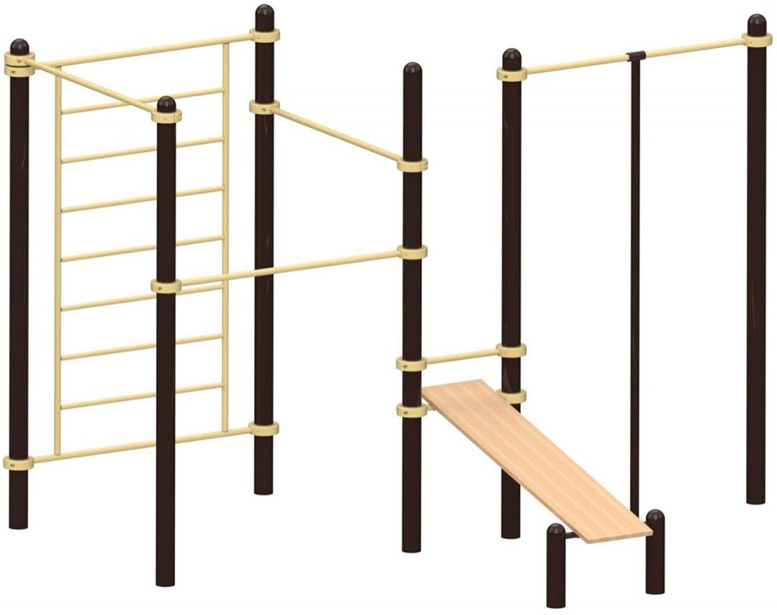 Элементы комплекса регулируются по высоте с помощью хомутов. Также возможно менять их расположение в пространстве благодаря круглым трубам, из которых они изготовлены.