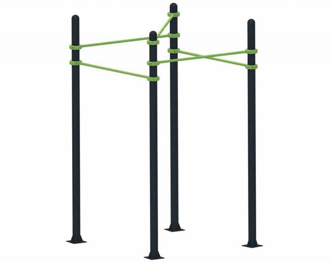 Спортивный комплекс выполнен из высококачественных материалов, таких как металл, что гарантирует его долговечность и надёжность. Окрашивание осуществляется полимерным порошковым покрытием, которое обеспечивает стойкость к механическим повреждениям и атмосферным воздействиям.
