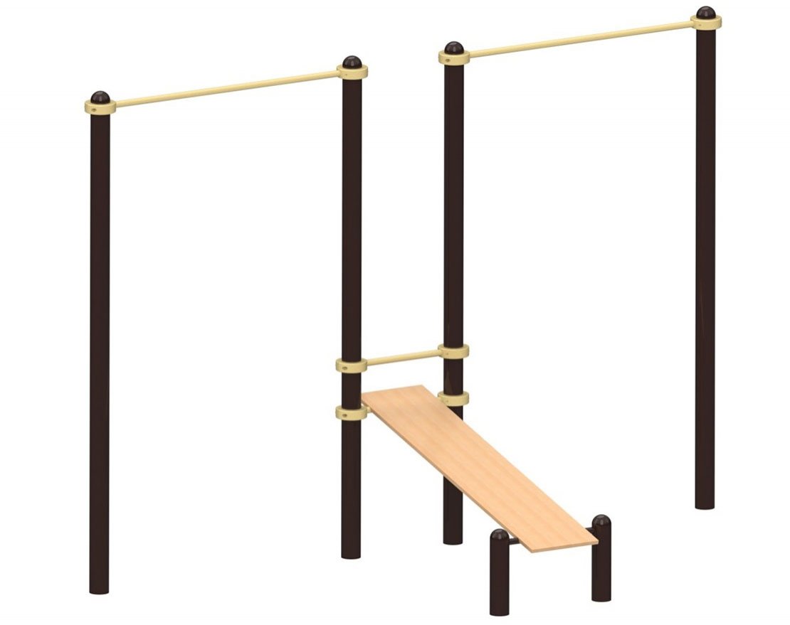 Турник незаменим для любой спортивной площадки. Он позволяет выполнять подтягивания и подъём переворотом, которые входят в общую физическую подготовку. Диаметр турника составляет 34 мм, толщина его стенки — 3,2 мм, а длина перекладины — 140 см.