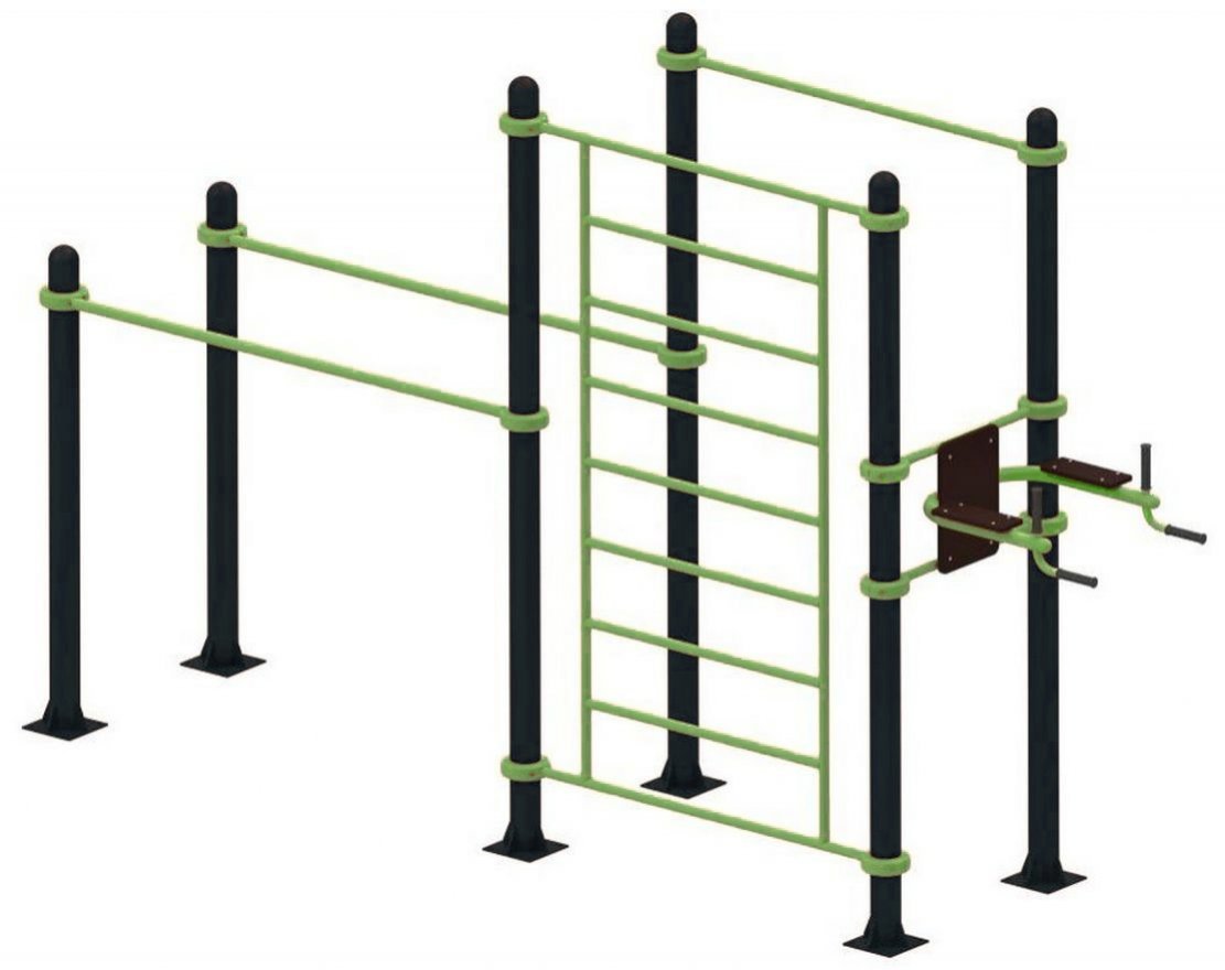 Все элементы комплекса регулируются с помощью хомутов по высоте и могут быть расположены в разных положениях благодаря круглым трубам.